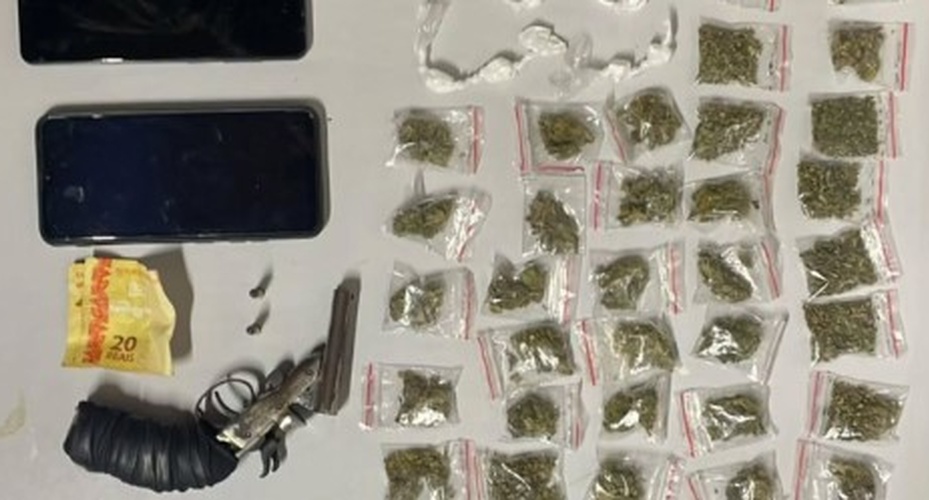 De acordo com a polícia, foram apreendidos 33 invólucros de maconha (52g), 11 petecas de cocaína (30g), uma arma de fogo calibre .22, tipo garrucha de dois canos e dois aparelhos celular.