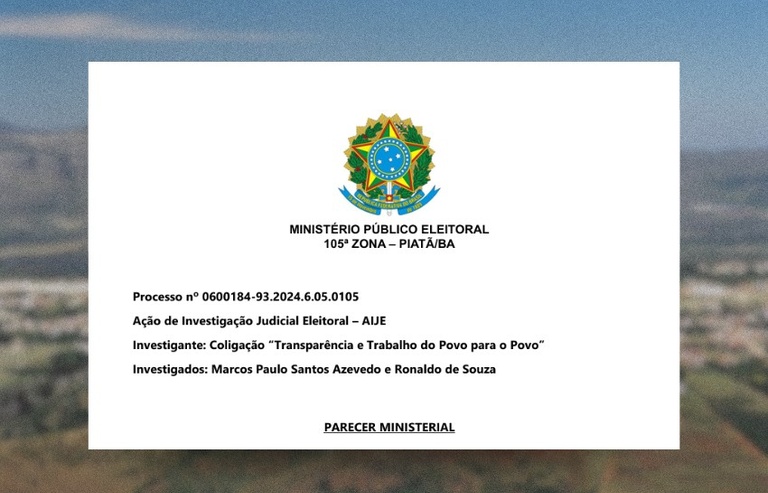 MPE recomenda cassação de prefeito e vice de Piatã por irregularidades eleitorais